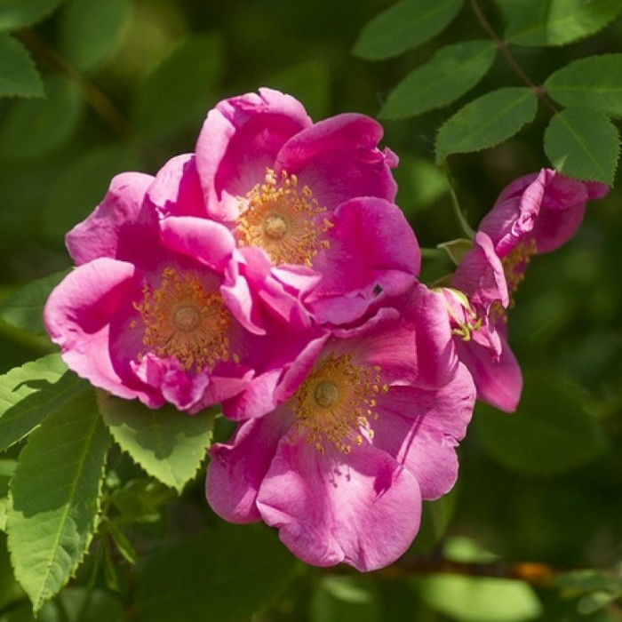 Rosier Ancien Botanique 'Arthur Hillier' (Hillier, Grand Bretagne, 1938) Hybride moyesii Ce grand arbuste offre des bouquets de fleurs simples, rose cramoisi où les étamines jaunes ressortent. Floraison tardive, non remontant mais magnifique fructification d'automne avec des fruits en forme de bouteilles rouge ardent.