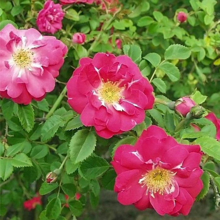 Rosier arbustif et paysagé 'BENGT M.SCHALIN' (Kordes, 1956). Cette variété séduit par ses bouquets de fleurs simple rose vif à cœur doré. Vigoureux, généreux et facile à cultiver, il illumine massifs et haies de sa floraison abondante. Sa résistance et son charme naturel en font un allié sûr pour les jardins fleuris.