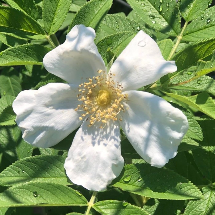Rosier arbustif & paysagé 'NYVELDT'S WHITE' (Nyveldt, 1955). Remontant, il vous gratifie de ses fleurs blanches épurées de juin jusqu'aux gelées, suivies par de jolis fruits décoratifs en automne. Son feuillage gaufré, typique des Rugosa, est insensible aux maladies. Un choix parfait pour un jardin serein.