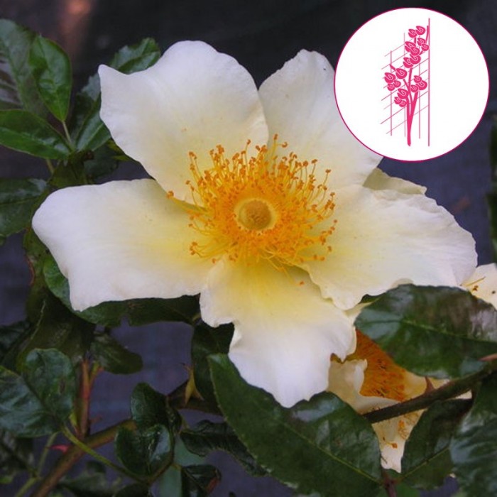 Rosier liane 'MERMAID' (Hybr. de Bracteata) Pau, 1919. Comment résister à d'immenses églantines d'or sur un feuillage vert d'olive, brillant, quasi persistant. Floraison de juin à novembre. Hauteur : 6 m. Rosier remontant.