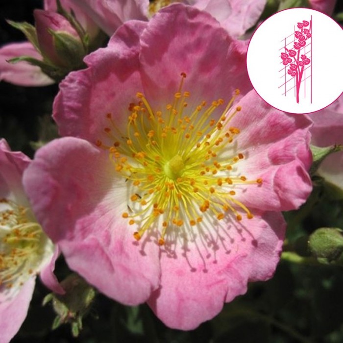 Rosier liane 'KEW RAMBLER' (Hybr. de Soulieana) Kew, 1912. Fleurs simples rose pâle avec le cœur plus blanc. Fruits oranges à l'automne. Non remontant mais tardif. Hauteur : 6 m et plus.