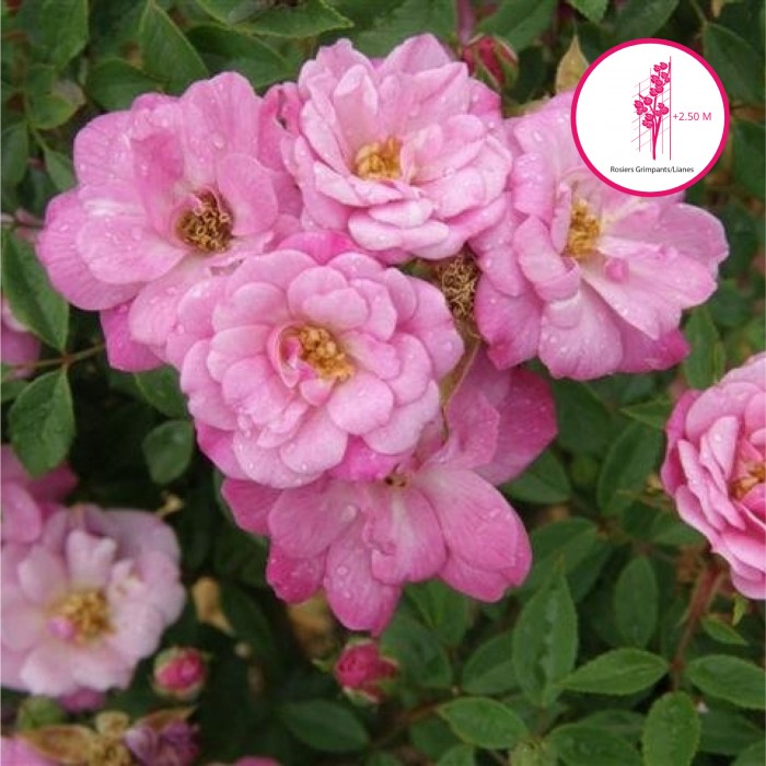 Rosier liane 'POMPON DE PARIS' (Inconnu, 1839). Apprécié pour sa floraison précoce, ce petit grimpant se pare dès le printemps de multiples fleurs miniatures d'un rose tendre. C'est un rosier de Chine facile à cultiver, qui s'adapte parfaitement aux petits espaces, arches et colonnes fleuries.
